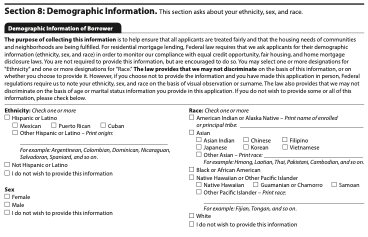 HMDA requires that you collect an applicant’s demographic information (DI) at the time of application. This includes providing the disclaimer below prior to requesting them to provide their DI (race, sex and ethnicity) as well as the options (main categories and subcategories for each) for them to self-identify. If the application is taken over the phone; however, this information must be read to them. Appendix B to §1003 #1 states, …for applications taken by telephone, you must state the information in the collection form orally, except for that information which pertains uniquely to applications taken in writing, for example, the italicized language in the sample data collection form.